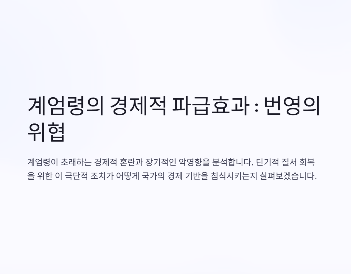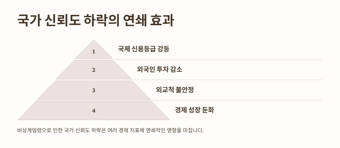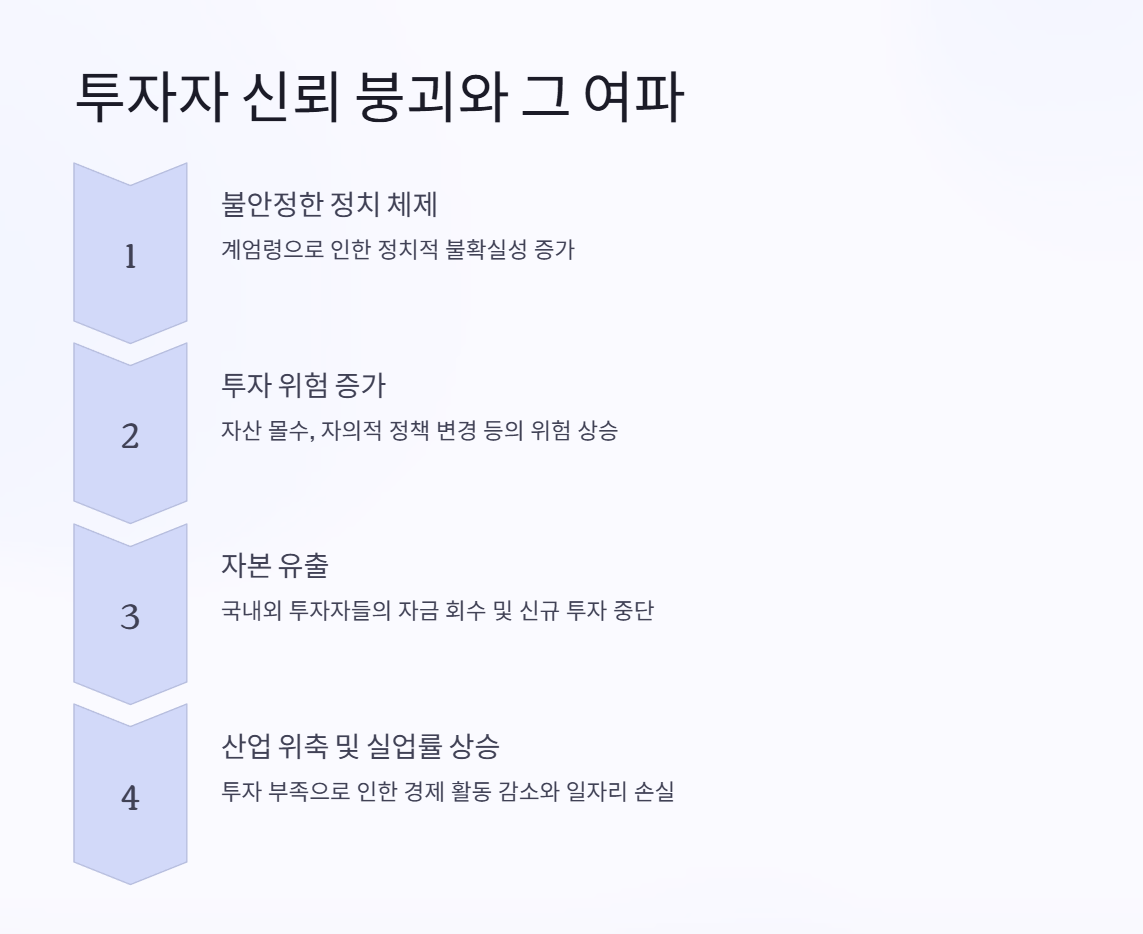 경제적 번영은 정부, 금융 기관, 사회 안정에 대한 신뢰의 토대에 달려 있습니다. 계엄령은 민주주의 체제를 해체하고 반대 의견을 침묵시킴으로써 이러한 신뢰를 약화시킵니다. 시민들이 지도자에 대한 신뢰를 잃으면 소비자 지출이 감소하고 경제가 더욱 위축됩니다. 더욱이, 널리 퍼진 두려움과 불확실성은 장기적인 경제 계획을 불가능하게 만듭니다.