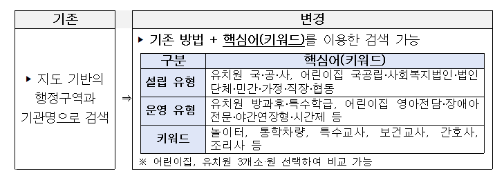 이제 학부모들은 자녀 한 명당 어린이집 3개소, 유치원 3개원까지 개별 신청이 가능하며, 기관 검색 시 원하는 조건을 바탕으로 핵심어를 활용해 최적의 기관을 선택할 수 있습니다.
